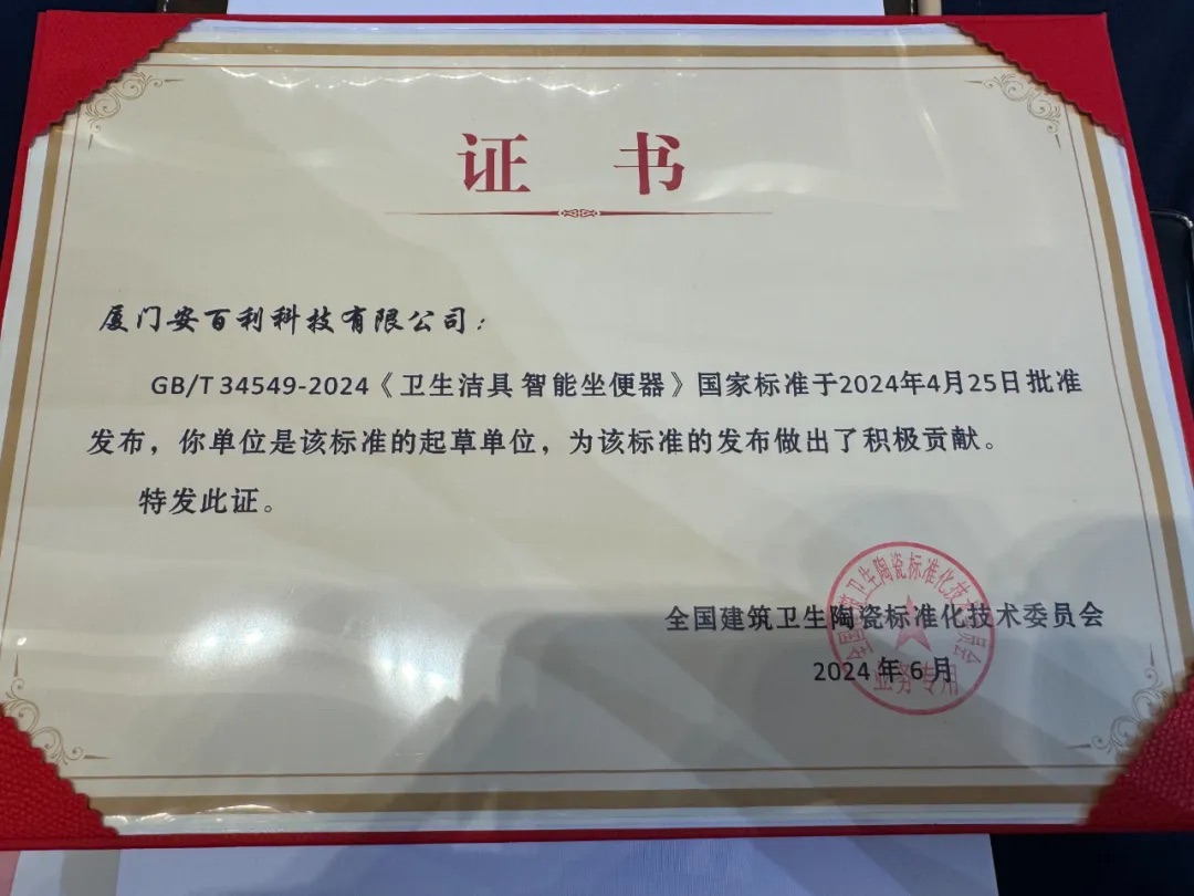 2024年6月25日,全国建筑卫生陶瓷标准化技术委员会年会暨GB/T 34549-2024《卫生洁具 智能坐便器》起草单位证书颁发,在四川成都盛大召开,期间传来令人振奋的喜讯,大会为厦门安百利颁发了中国《卫生洁具 智能坐便器》行业标准起草单位的证书,这一里程碑式的成就标志着安百利正式全面进入智能马桶领域,开启了发展的新篇章。